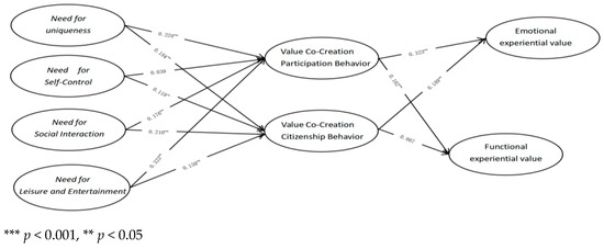 Subsequently, the path coefficients were calculated using AMOS 24.0, as shown in Figure 2. The results reveal that all standardized path coefficients are positive, suggesting that the relationships between the variables are positively influenced. This finding aligns with the results of the qualitative research conducted in Study 1. Furthermore, with respect to significance testing, most path relationships were found to be significant. However, the path coefficient for the relationship between the need for self-control and participation behavior was 0.039, with a p-value of 0.253, indicating that this path did not achieve statistical significance. Similarly, the path coefficient for the relationship between civic behavior and functional experience value was 0.067, with a p-value of 0.098, which also failed to reach statistical significance.