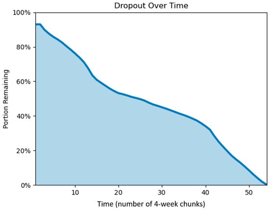 The dataset began with 15,000 randomly selected users who had initiated their first annual membership with Calm in 2017. Three-quarters of the sample was selected because they renewed their subscription at least once, which was used as a proxy for maintained app use. However, many users were not using the app and had their subscriptions automatically renewed. This can be observed in the high dropout rates following the start of users’ initial subscriptions. As seen in Figure 1, there was a steep decline in the percentage of users who used the app in any future chunk of data. By chunk 15 (i.e., week 60), only 60.9% of users used the app in at least one future chunk of data. By chunk 30 (i.e., week 120), this percentage dropped to 45.0%, and by chunk 45 (i.e., week 180), this number dropped to less than 20.0%.