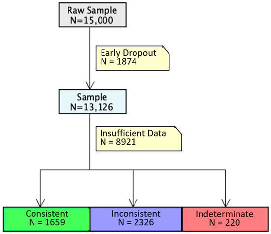 A significantly smaller sample of users was categorized into our three behavioral phenotypes than was contained in the original dataset since many users had insufficient data. Figure 2 describes how the sample size was reduced throughout this pattern detection process. First, 1874 users were dropped because they had less than three full chunks worth of data before they dropped out of the sample. Then, 8921 users were dropped because they had infrequent usage data, which prevented the estimation of our model of future app use. This was largely driven by our inaccurate method of sample selection, which relied on subscription renewal as a proxy for maintaining some degree of meaningful app use. Instead, many users displayed highly sporadic app use that made calculating temporal consistency infeasible and/or estimating our models of future app use impossible.