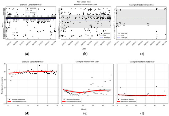 Figure 3 illustrates typical usage patterns from the Consistent, Inconsistent, and Indeterminate phenotypes. In the top half of Figure 3, the time of day of each meditation session is plotted by day, and the bottom of Figure 3 shows the number of meditation sessions by a chunk of data along with the user’s panel regression model predictions for the number of meditation sessions smoothed over the full time period. This figure shows that the panel regression models did a sufficient job of fitting the number of meditation sessions for each phenotype. Importantly, the figure also demonstrates that important differences existed in users’ patterns in the time of day of mindfulness meditation sessions. The consistent user (Figure 3a) is characterized by performing mindfulness meditation at a similar time of day for their entire period of app use. Specifically, this user favored performing mindfulness meditation at or around 7 AM every day. Meanwhile, the inconsistent user (Figure 3b) is characterized by constant but variable meditation session start times. In other words, while this user did frequently perform mindfulness meditation, there was no clear pattern in the time of day. Lastly, the indeterminate user (Figure 3c) is characterized by sparse use. Although this user maintained minimal app use for at least as long as the other two users, there were several long gaps with no app use. These three examples also help to demonstrate what behavioral patterns result in low (Figure 3d), medium (Figure 3e), and high (Figure 3f) values for our temporal consistency measures. Specifically, the average chunk of data for the user (Figure 3d) corresponds to a session timing variance of 0.17 (SD 0.25), entropy of 0.22 (SD 0.08), and an adjusted DTW with the prior chunk of 0.34 (SD 0.54). The average chunk of data for user (Figure 3e) corresponds to a session timing variance of 1.34 (SD 2.14), entropy of 0.52 (SD 0.38), and an adjusted DTW with the prior chunk of 1.25 (SD 1.85), and the average chunk of data for user (Figure 3f) corresponds to a session timing variance of 4.88 (SD 6.73), entropy of 0.73 (0.64), and an adjusted DTW with the prior chunk of 2.29 (SD 3.19).