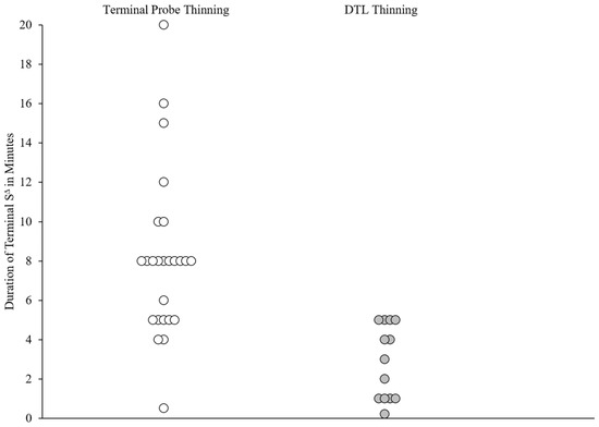 Duration of terminal S∆. Note: Terminal SΔ durations across schedule-thinning procedures. White circles represent applications of TP thinning and dark gray circles represent applications of DTL thinning.