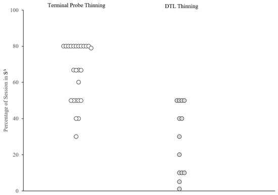 Percentage of session with active S∆. Note: Percentage of session with active SΔ across schedule-thinning procedures. White circles represent applications of TP thinning and dark gray circles represent applications of DTL thinning. The Y–Axis denotes the percentage of session with an active SΔ for the corresponding application.