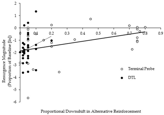 The data were prepared and analyzed using procedures consistent with those described by Shahan and Greer (2021) and Falligant et al. (2022). Briefly, the response rates for challenging behavior were converted to a proportion of baseline for the first two sessions following a downshift in alternative reinforcement, as divided by the average rate of challenging behavior during the baseline. Resurgence was defined as an increase in the rates of challenging behavior during one of these two post-downshift sessions relative to the maximum rate of challenging behavior observed in the three sessions before the downshift in alternative reinforcement. We calculated the relative size of the downshift in alternative reinforcement availability based on the difference in the proportion of the session the SD component of the multiple schedule was in operation for relative to the SΔ component before and after each schedule-thinning step. We plotted the proportional levels of challenging behavior against the size of the downshift in alternative reinforcement in semi-logarithmic (ln) space to examine the relationship between resurgence and downshifts reinforcer availability during schedule thinning. Only applications in which resurgence was observed were included in the analysis. We subsequently fit a linear regression model, which was calculated using the ordinary least squares method, to these data. Because these data were in semi-logarithmic space, a significant linear trend would be evidence of an exponential relationship between the resurgence magnitude and downshift size.