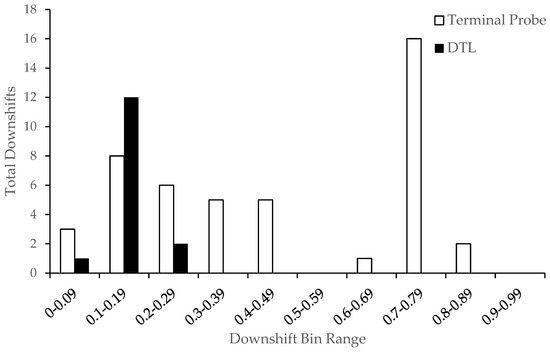Total numbers of downshifts in reinforcer availability across downshift bin ranges. Note: Total number of downshifts in reinforcer availability at each downshift bin range. A downshift bin range denotes the proportional size of the change between the preceding and upcoming schedule-thinning step. For example, smaller bin ranges denote smaller proportional downshifts in the alternative reinforcement.