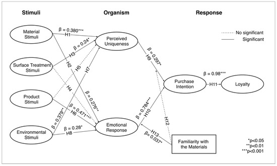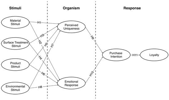 Building on these hypotheses, we propose a model (Model 1) where material, surface treatment, environment, and product act as stimuli (S); perceived uniqueness and emotional response serve as organisms (O); and purchase intention and loyalty function as response variables (R) (Figure 1).