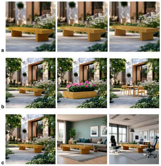 Three identical WPCs samples (60 mesh, 30 wt% mixing ratio of pine powder and PCL) were selected for surface treatment and numbered as M1, M2, and M3, respectively. Sample M1 underwent a paint treatment, with the surface left to dry. The surface of M2 was sanded using 60 mesh sandpaper, and the dust was subsequently removed. M3 served as the control group, without any surface treatment. After the treatment, the surface conditions of these materials were photographed under natural light. The images were then uploaded to the computer, and Adobe Photoshop was used to combine the photographs of the different surface treatments with a courtyard scene generated by Midjourney. This process simulated the effects of the different surface treatments on the products within the same scene (Figure 5a).