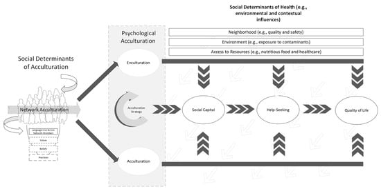 Moreover, the framework includes outcome variables indicative of adaptation, which are consistent with QoL. The framework aligns with existing stress process models (see Berry & Sam, 2016) and cross-cultural models (see Ward & Geeraert, 2016) that describe the temporal ordering of acculturation relative to these adaptive outcomes. Network and psychological acculturation then serve as cultural determinants for social capital, help-seeking, and QoL, further shaped by other determinants that influence health and health-related outcomes. The current study seeks to extend existing research by testing a structural model of quality of life that includes social networks as a determinant of psychological acculturation along with social capital and help-seeking. While studies examining acculturation and social capital are increasing, there is a dearth of research incorporating social networks as determinants of acculturation and other social and QoL outcomes for Latino/a adults. Moreover, a limited number of studies have examined the role of social capital in facilitating help-seeking and QoL. The current study tests the following hypotheses to address existing gaps in the literature: