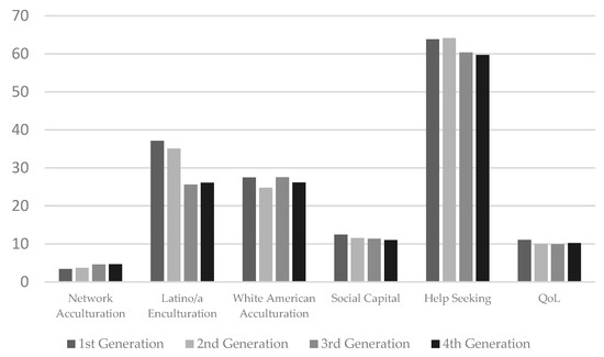Means of network acculturation, Latino/a enculturation, White American acculturation, social capital, help-seeking, and QoL by generational status group.