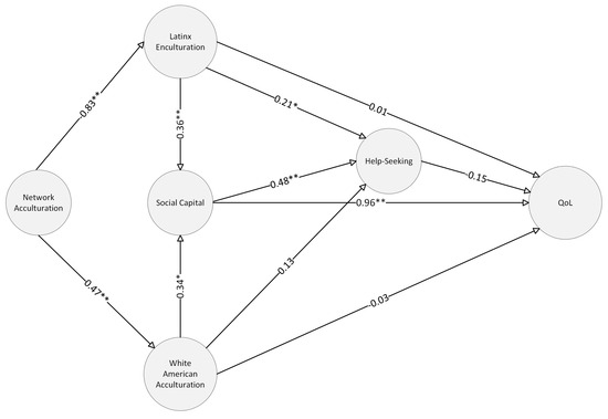 Direct effects of network acculturation, Latino/a enculturation, White American acculturation, social capital, and help-seeking on QoL.