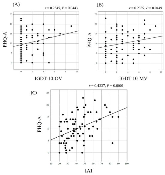 Correlation of the severity of depressive symptoms with gaming disorder and Internet addiction. (A) shows the correlation between PHQ-A and IGDT-10-OV, (B) shows the correlation between PHQ-A and IGDT-10-MV, and (C) shows the correlation between PHQ-A and IAT. PHQ-A: The Patient Health Questionnaire for Adolescents; IGDT-10: the Ten-Item Internet Gaming Disorder Test; OV: original version; MV: modified version; IAT: Internet Addiction Test.