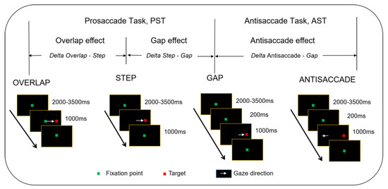 - Munoz, D. P., & Everling, S. (2004). Look away: The anti-saccade task and the voluntary control of eye movement. Nature Reviews Neuroscience, 5(3), 218–228. [Google Scholar] [CrossRef]
