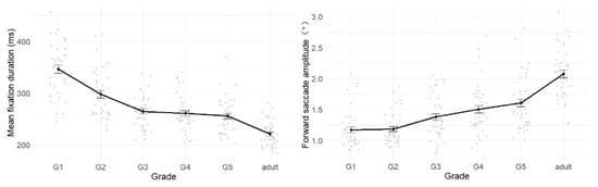 As children age, mean fixation duration decreases (Figure 2, left), and forward saccade amplitudes increase (Figure 2, right). Significant developmental changes in mean fixation duration were observed between first and third grade, while forward saccade amplitudes showed significant development between second and third grade. Beyond third grade, the development of both eye movement measures plateaued, but significant differences remained between fifth grade children and adults.