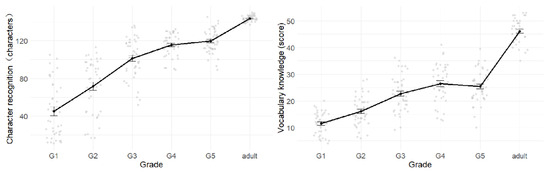 Children’s performance in Chinese character recognition (Figure 3, left) and vocabulary knowledge (Figure 3, right) showed significant yearly improvements before fourth grade, with no notable development observed between fourth and fifth grade. Nevertheless, both abilities in fifth grade remained significantly lower than those of adult readers. The specific statistical comparisons are as follows.