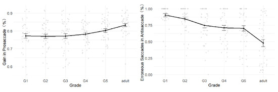 For the percentage of gain in the prosaccade tasks, first to fourth graders showed significantly lower scores than adults group (|ΔM|s > 0.05, ps < 0.05), but no significant differences were found between adjacent grades or among other groups (|ΔM|s < 0.03, ps > 0.05). For the percentage of erroneous saccades in the antisaccade task, first graders exhibited significantly higher error rates than readers in third grade and above (|ΔM|s > 0.15, ps ≤ 0.05). All children had significantly higher error rates than adults (|ΔM|s > 0.22, ps ≤ 0.001). However, no significant differences were observed between adjacent grades or among other groups (|ΔM|s < 0.14, ps > 0.05).