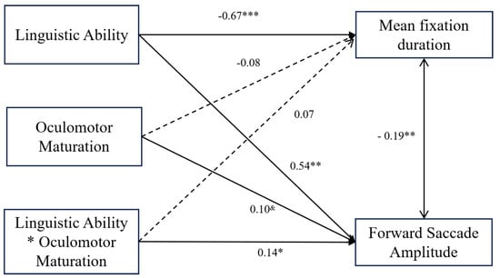The path analysis results (Figure 5) demonstrated distinct contributions of linguistic abilities and oculomotor maturation to reading eye movement patterns. When mean fixation duration was the predicted variable, linguistic abilities had a significant negative predictive effect (β = −0.67, p < 0.001), indicating that stronger linguistic abilities were associated with shorter fixation durations. In contrast, oculomotor maturation showed no significant predictive effect (β = −0.08, p = 0.11), and the interaction term between linguistic abilities and oculomotor maturation was also not significant (β = 0.07, p = 0.21).