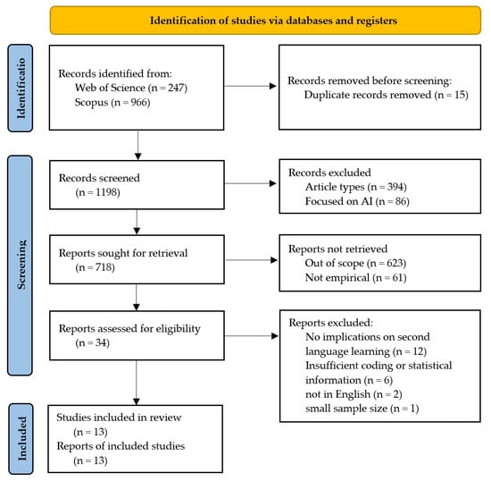 Fifteen duplicate records were removed, leaving 1198 unique records for screening. The initial title and abstract screening excluded 480 records based on the following criteria: article type not suited to this analysis (e.g., opinion pieces, book chapters, non-peer-reviewed sources) (n = 394) and studies primarily focused on artificial intelligence rather than cognitive or personality factors in L2 learning (n = 86). A full-text review was conducted on the remaining 718 records. At that stage, 684 records had to be excluded. Of these, 623 were clearly out of scope since they did not directly examine the personality, intelligence, and second language learning relationship, and instead were focused on the general cognitive development, other forms of academic performance not related to language, or applications of artificial intelligence that do not involve human personality traits. Additionally, 61 were not empirical, as they comprised theoretical papers, reviews of the literature, or conceptual discussions devoid of original data or statistical analysis. Following this rigorous screening, 34 studies were assessed for eligibility based on strict inclusion criteria, ensuring that only empirical research with direct relevance to personality, intelligence, and L2 learning was considered. At that stage, 21 studies were further excluded because they had no direct relevance to second language learning (n = 12); lacked coding or statistical information (n = 6); were in a language other than English (n = 2); or had a very small sample size (n = 1). This resulted in a total of 13 studies satisfying all the inclusion criteria and included in the final systematic review. Two independent reviewers extracted data from each included report, working independently to ensure accuracy, with no automation tools used and no additional processes for obtaining or confirming data from study investigators. These 13 studies represent a diverse range of methodologies, sample populations, and L2 learning contexts, ensuring a well-rounded and reliable synthesis of the existing research.