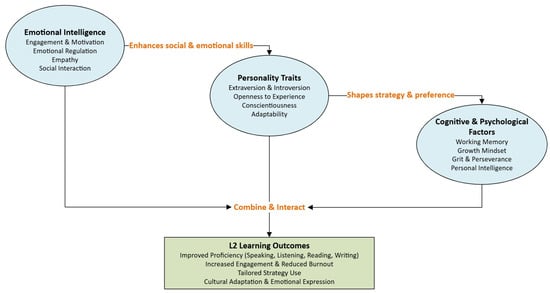 In L2 contexts, emotional intelligence induces learner engagement, motivation, and social adaptation by integrating components such as well-being, sociability, emotional regulation, and empathy. Personality traits, such as extraversion, openness to experience, and conscientiousness, influence learners’ preferences for strategies and tasks, with extraverts excelling in group interactions and introverts favoring independent learning. Cognitive and psychological factors, including working memory, growth mindset, grit, and personal intelligence, provide the cognitive and motivational tools necessary for language acquisition, supporting learners in retaining information and persevering through challenges. These factors interact in meaningful ways: EI and personality traits collectively govern social and emotional dimensions of learning; personality shapes how cognitive strategies are employed; and EI supports stress management and focus, amplifying the effects of cognitive abilities. Together, these interconnected elements contribute to improved L2 proficiency, sustained engagement, tailored learning strategies, and greater cultural and emotional adaptation.