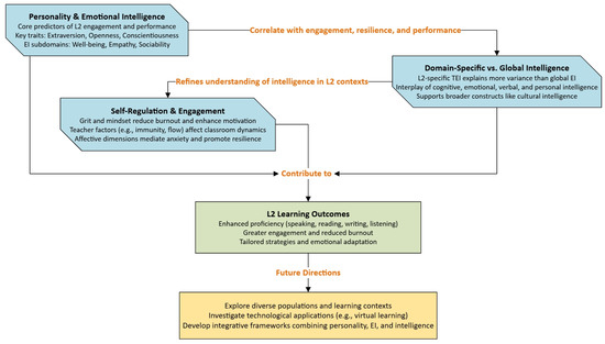 Thus, taken collectively, these 13 studies indicate that personality and intelligence—and most specifically emotional intelligence—serve as vital explanatory constructs for understanding why and how learners differ in L2 achievement, L2 engagement, and emotional experience (see Figure 3). Different traits or subdomains (e.g., conscientiousness, extraversion, well-being, empathy) offer a strong predictive power for language performance, resilience, and identity shifts. Such a synthesis also shows domain-specific approaches (e.g., L2-TEI, personal intelligence) to further explore the complex interplay of individual differences in L2 contexts. Such revelations closely resemble the broader research arena where personality dimensions and intelligence measures have been associated with academic attainment (Meyer et al., 2023; Stanek & Ones, 2023), emotional–behavioral outcomes (Quílez-Robres et al., 2023; Vashisht et al., 2021), and second language achievements (Dewaele et al., 2008; Taheri et al., 2019). Looking forward, integrated systems evaluating the synergy of trait EI with general intelligence, specific forms of intelligence (such as cultural intelligence and personal intelligence), and personality in conjunction with contextual variables (such as the use of IPAs, virtual learning environments) will provide critical building blocks for intervention design, teacher training modules, and personalized language learning pathways.