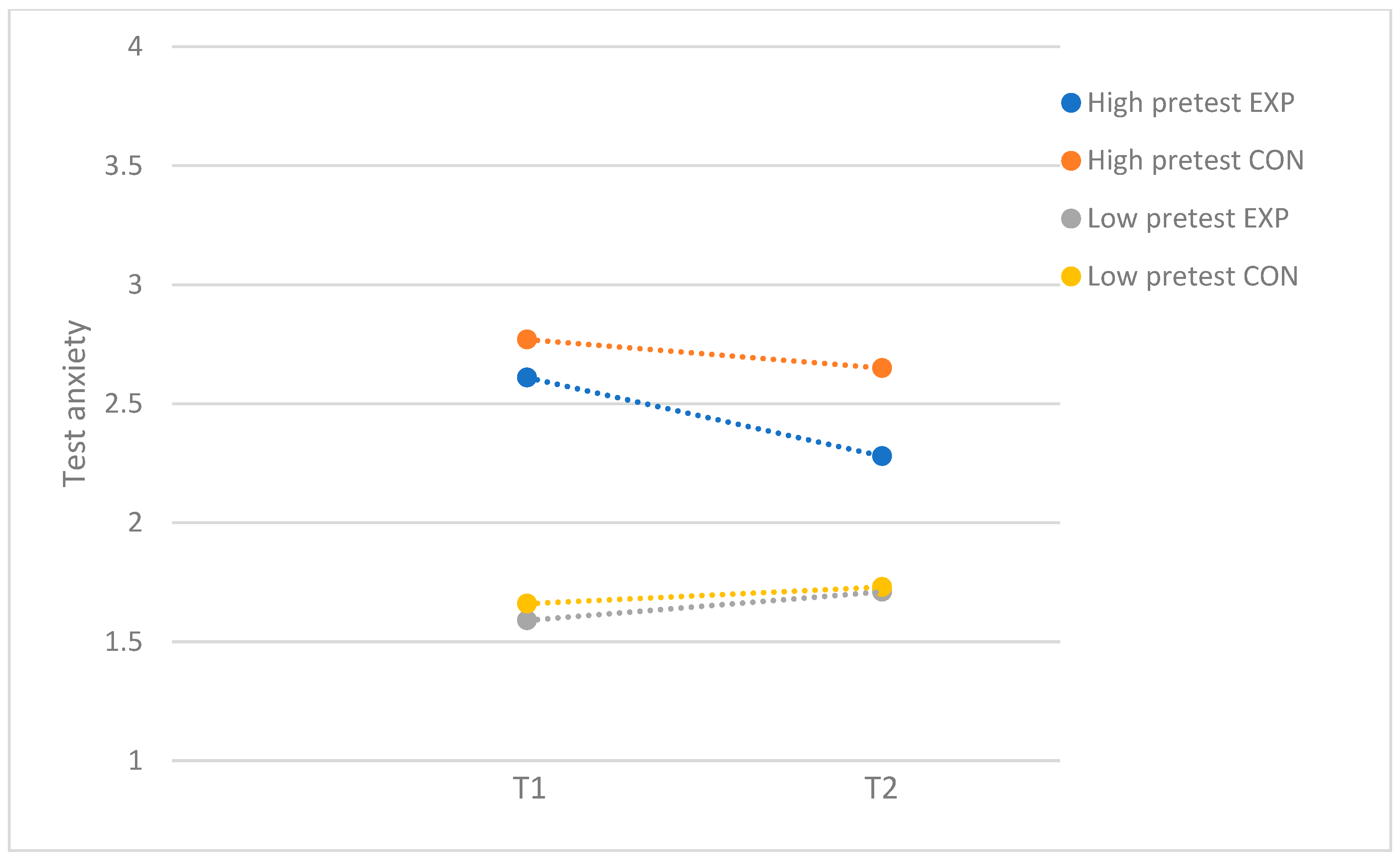 Figure 2. Test anxiety: moderation by problem severity, with subsample of participants who attended more than half of the sessions. EXP = experimental group; CON = control group.