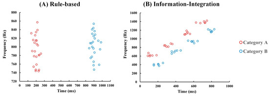 In the rule-based task, the auditory stimuli were pure tones generated using Adobe Audition 2019. The pure tone was composed of unidimensional structures, encompassing variations in frequency and duration. Specifically, the average value for category A in the time dimension was 200 ms, while for category B, it was 900 ms. In terms of frequency, the mean values were 800 Hz for each respective category. Each stimulus in both categories was generated using a bivariate normal distribution with a standard deviation of 30 and no correlation coefficient (Table 1). According to this methodology, a total of 48 stimuli were randomly generated with an equal distribution of 24 stimuli in each category (see Figure 1. Each stimulus was replicated four times, resulting in a cumulative count of 192 trials. In the information-integration task, the auditory stimuli varied simultaneously in both duration and frequency dimensions. For each category, auditory stimuli were generated using four bivariate normal distributions with a standard deviation of 30 and zero correlation coefficient. Six stimuli were randomly drawn from each distribution, resulting in a total of 24 stimuli per category and 48 stimuli overall. Table 1 presents the corresponding distribution parameters for each category structure. Both sets of distributions for the category structure were created using R 4.2.1 software. All auditory materials were generated using Adobe Audition 2019.