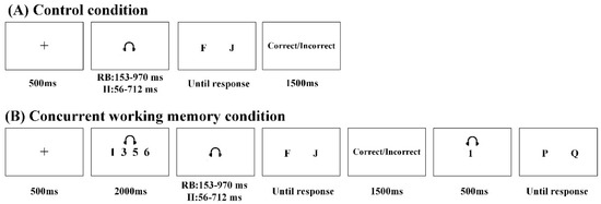 Figure 2. Trial procedure in the rule-based task and the information-integration task. (A) The trial procedure in the control condition; (B) the trial procedure in the concurrent working memory condition.