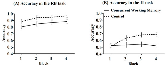 Figure 3. Results for accuracy. (A) The accuracy in the rule-based task; (B) the accuracy in the information-integration task. Note: The error bar represents the standard error. RB represents rule-based; II represents information-integration.