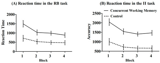 Considering that most participants employed a rule-based strategy in both the rule-based and information-integration tasks, we aggregated the participants who employed the rule-based strategy from both the experimental and control groups for further analysis. A 2 (condition: concurrent working memory condition vs. control condition) × 4 (block: 1 to 4) mixed-design ANOVA was conducted on accuracy and reaction time. Firstly, for accuracy, the main effect of the condition was significant, F (1, 83) = 10.56, p = 0.002, ηp2 = 0.11. The results suggested that the concurrent working memory task interfered with the rule-based strategy. The main effect of block was significant, F (3, 249) = 18.83, p < 0.001, ηp2 = 0.19, suggesting a learning effect. The interaction was significant, F (3, 249) = 18.83, p = 0.002, ηp2 = 0.06. Post hoc analysis revealed that accuracy in the control condition was significantly higher than in the concurrent working memory condition across blocks 2 to 4 (ps < 0.001). Secondly, for reaction time, the main effect of condition was significant, F (1, 83) = 29.01, p < 0.001, ηp2 = 0.26. The results suggested that the concurrent working memory task interfered with the rule-based strategy. The main effect of block was significant, F (3, 249) = 22.43, p < 0.001, ηp2 = 0.21. The interaction was significant F (3, 249) = 2.90, p = 0.04, ηp2 = 0.03. Post hoc analysis revealed that the reaction time was faster in the control condition than in the concurrent working memory condition across all blocks (ps < 0.001).