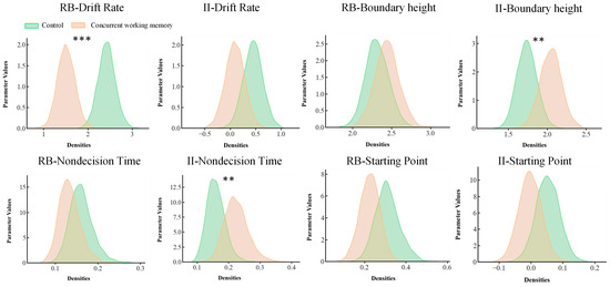 Figure 5. HDDM results for the control and concurrent working memory condition under the rule-based task and the information-integration task. Note: p < 0.001 ***; p < 0.05 **.