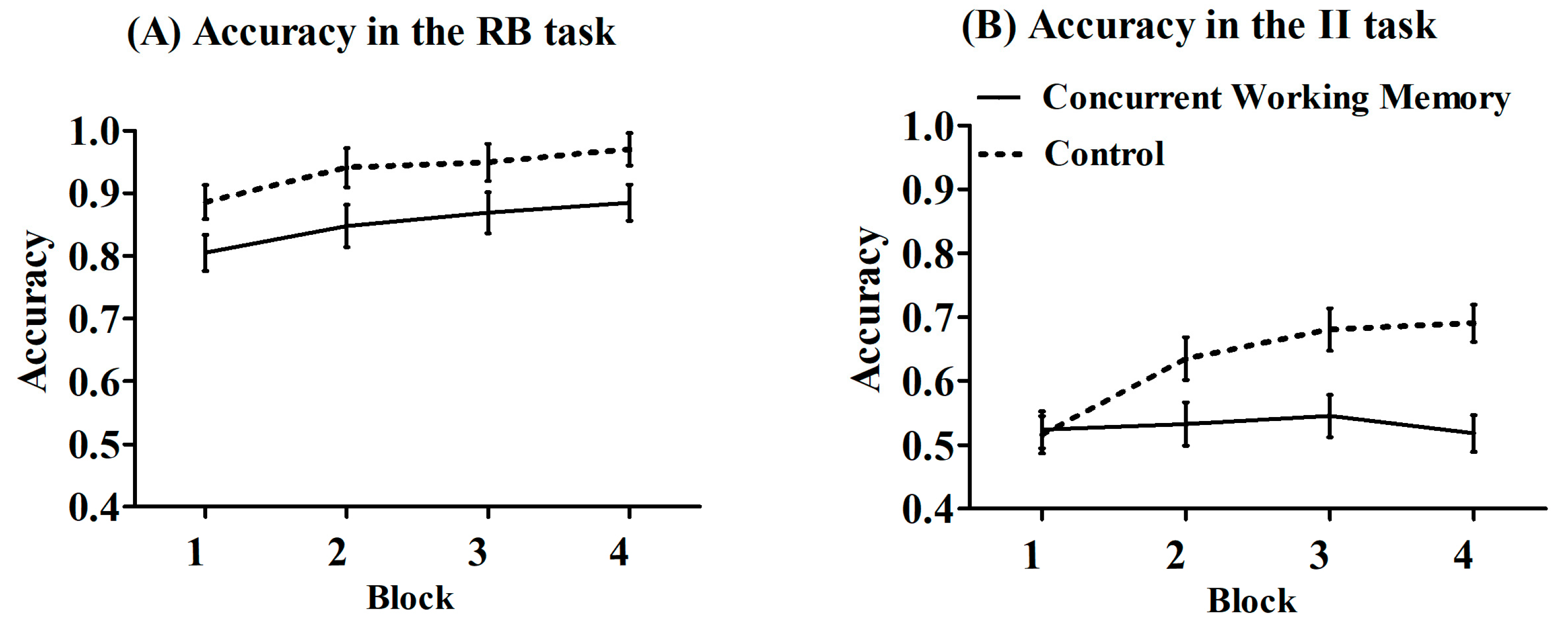 Furthermore, working memory (WM) is a limited capacity system that temporarily stores and processes information (Baddeley, 1992). Given the separate mediation of rule-based category learning and information-integration category learning by the explicit and procedural learning systems (Ashby et al., 1998; Ashby & Maddox, 2005, 2011), it is expected that working memory may have distinct roles in these two types of tasks. Previous studies have indicated negligible impact of working memory on implicit learning (Barnes et al., 2008; Bo et al., 2011, 2012; Brown et al., 2010; Janacsek & Nemeth, 2013; Kaufman et al., 2010; Nemeth et al., 2012; Sefcsik et al., 2009; Vicari et al., 2007) and attention (Curran & Keele, 1993; Frensch et al., 1998; Jiménez & Vázquez, 2005; Jiménez & Méndez, 2001). Conversely, when the learning process is explicit or intentional, working memory becomes involved in guiding attention focus and cognitive control (Bo et al., 2012; Feldman et al., 1995; Unsworth & Engle, 2005). Many studies investigated whether working memory plays different roles in rule-based and information-integration category learning. Accordingly, some results indicate that the concurrent working memory task is likely to exerts a more substantial influence on explicit category learning, such as the rule-based task, while leaving a relatively minor impact on implicit category learning, such as the information-integration task (Miles & Minda, 2011; Wu & Fu, 2021; Zeithamova & Maddox, 2006, 2007). Furthermore, recent studies found working memory ability is related to the speed or accuracy of category learning (Craig & Lewandowsky, 2012; Lewandowsky et al., 2012; Lloyd et al., 2019; McHaney et al., 2021; Souza et al., 2024). Specifically, some studies have found that working memory is associated with higher accuracy, as well as faster and slightly more cautious decision-making in non-native speech category learning (Souza et al., 2024).