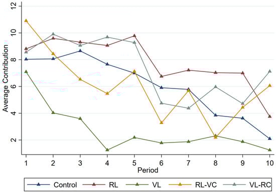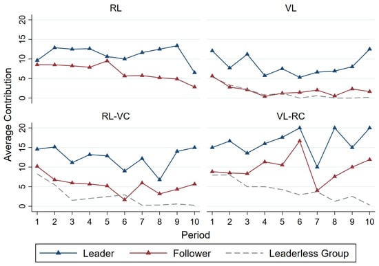 Table 2 lists the average contributions of all treatments. In none of the leadership treatments did the contribution levels significantly exceed those in the baseline treatment (Wilcoxon rank-sum test, RL vs. Control: p = 0.098; VL vs. Control: p < 0.001; RL-VC vs. Control: p = 0.216; VL-RC vs. Control: p = 0.229). The average contribution in VL is significantly lower than that in Control, RL, RL-VC, and VL-RC. Further 0.341 (p < 0.001), indicating a significant difference between the two. The comparison between RL and VL shows an effect size oanalysis is provided in Appendix B, Table A1. The effect size between the Control and the VL is 3.341 (p < 0.001), indicating a significant difference between the two. The comparison between RL and VL shows an effect size of 5.106 (p < 0.001, confidence interval [3.672, 6.541]), further demonstrating that the contribution in the RL group is significantly higher than in VL. Notably, the comparison between VL-RC and VL reveals an effect size of −4.619 (p < 0.001, confidence interval [−5.995, −3.243]), indicating that the contribution in VL-RC is significantly higher than in VL. This result highlights the significant advantage in contributions of VL-RC, showing a marked improvement over VL. The average contributions in RL and VL-RC are significantly greater than that in VL and are similar to or slightly greater than the average contribution in the Control.3