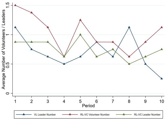 Average number of volunteers or leaders over periods by treatment.