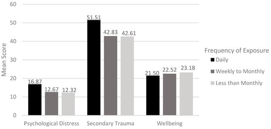 Mean scores on psychological distress, secondary trauma, and wellbeing by frequency of exposure.