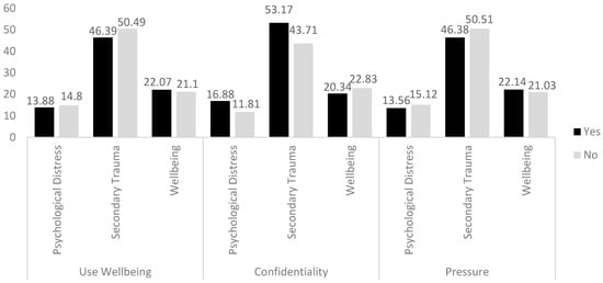The MGLM demonstrated that using wellbeing services was not significantly associated with psychological distress (F(1, 152) = 3.37, n.s.) or wellbeing (F(1, 152) = 1.29, n.s.), but those who used wellbeing services had significantly lower secondary trauma symptoms (F(1, 152) = 4.46, p = 0.036). Concerns about confidentiality were significantly associated with higher psychological distress (F(1, 152) = 28.94, p < 0.001), secondary trauma (F(1, 152) = 24.38, p < 0.001), and lower wellbeing (F(1, 152) = 8.76, p = 0.004). There were no associations between the services understanding the pressure of their role and wellbeing (F(1, 152) = 1.15, n.s.), psychological distress (F(1, 152) = 1.65, n.s.), or secondary trauma (F(1, 152) = 3.04, n.s.) (see Figure 2). An interaction effect between concerns about confidentiality and using wellbeing services was checked but was found not to be significant for any of the outcomes.