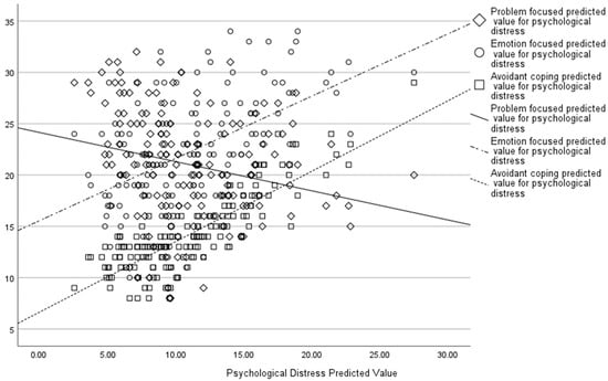 An MGLM showed problem-focussed coping was associated with lower psychological distress (F(1, 152) = 27.26, p < 0.001), secondary trauma (F(1, 152) = 23.81, p < 0.001), and greater wellbeing (F(1, 152) = 33.38, p < 0.001). Emotion-focussed coping was also associated with lower psychological distress (F(1, 152) = 8.99, p = 0.003), secondary trauma (F(1, 152) = 9.14, p = 0.003), and greater wellbeing (F(1, 152) = 4.01, p = 0.047), whilst avoidant coping was associated with greater psychological distress (F(1, 152) = 28.64, p < 0.001), secondary trauma (F(1, 152) = 27.35, p < 0.001), and lower wellbeing (F(1, 152) = 9.03, p = 0.003). An increase in psychological distress scores was associated with increased emotion-focussed coping and avoidant coping, whereas problem-focussed coping was associated with a decrease in psychological distress scores (see Figure 3).