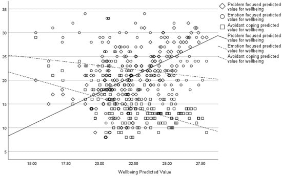 Lastly, wellbeing demonstrated the opposite pattern, where it increased with problem-focussed coping and decreased with greater emotion-focussed and avoidant coping (see Figure 5).