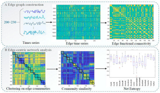 Figure 2. Flow of edge-centric functional network analysis: (A) Edge graph construction and edge functional connectivity calculation. (B) Edge-centric network analysis, including edge community clustering and entropy and community similarity calculations.