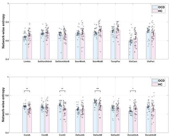 Figure 3. Network entropy in patients with obsessive–compulsive disorder (OCD) and healthy control s (HCs). *: Indicates p < 0.05; **: Indicates p < 0.01; ***: Indicates p < 0.001.