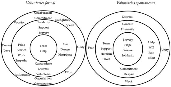 Table 2 presents the analysis of the weight of categories compared between formal and spontaneous volunteers. A total of seven categories (Social Capital, positive Emotions/Feelings, negative Emotions/Feelings, values, volunteers’ perception, natural elements, and volunteer behavior) were created inductively using a data-driven coding technique, in which the evoked words were coded and assigned to the generated categories based on the collected information. Subsequently, following the criteria of the categorical analysis of social representations—such as word frequency, frequency of evocations, and frequency of evocations of core words—the categories with the highest presence according to each criterion were identified. This resulted in three prominent categories for formal volunteers and two for spontaneous volunteers.