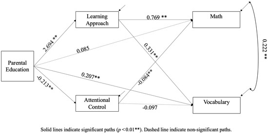 Parental education has an indirect effect on children’s math ability and children’s vocabulary via children’s learning approaches and attentional control.