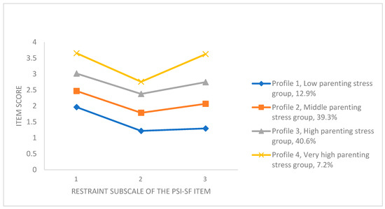 Profile 4 was the very high parenting stress group. In this profile, the total PSI-SF questionnaire score was 120.456, which was consistent with a very high level of parenting stress (with a score ≥ 99), as defined by Abidin (1990b). Profile 4 included 7.2% of the participants, which was the lowest percentage of the four profiles. This result is consistent with that of Xiang et al. (2014), who reported that individuals scoring high on all parenting stress items had the smallest sample size (Xiang et al., 2014). This group reported the highest overall level of parenting stress of the four groups. Moreover, subscale 3 (difficult child) was significantly higher than the rest of the profiles. Thus, difficult children may be a key indicator of high parenting stress among Chinese parents. In contrast, scores on subscale 2 (parent–child dysfunctional interaction) did not stand out as significantly higher than the scores on the other profiles, suggesting that Profile 4 is more likely to be affected by difficult children than by parent–child dysfunctional interactions leading to greater parenting stress. This finding is consistent with a previous longitudinal study that showed that higher levels of externalizing behavior problems, anger tendencies, and emotional dysregulation were associated with greater parenting stress in early childhood (Williford et al., 2007).