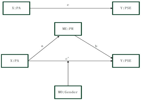 Prior to conducting the analysis of gender differences, we first performed a multi-group confirmatory factor analysis (MGCFA) to establish the measurement invariance of the scale across genders. The results indicated that factor loadings, intercepts, and error variances were equivalent across genders, suggesting that the measurement approach of the scale is consistent across different genders. Consequently, we can confidently proceed with the comparison of gender differences. To evaluate Hypothesis H5, a multivariate analysis of variance (MANOVA) was performed with gender as the independent variable and physical activity, psychological resilience, and physical self-efficacy as the dependent variables. The variance analysis outcomes for gender differences are detailed in Table 11. The following statistical results are all based on the data after logarithmic transformation. MANOVA revealed a significant main effect of gender on high-intensity physical activity (F = 17.440, p < 0.001) and moderate-intensity physical activity (F = 4.338, p < 0.05). Conversely, the main effects of gender on walking time (F = 0.007, p > 0.05) and sedentary time (F = 1.285, p > 0.05) were nonsignificant. A significant main effect of gender was also found for total physical activity (F = 24.407, p < 0.001). However, the main effect of gender on psychological resilience was marginally significant (p < 0.05), which does not support a mediation effect model with gender as the primary moderating factor. Furthermore, a significant main effect of gender on physical self-efficacy was noted (F = 13.469, p < 0.001). Subsequent post hoc multiple comparisons revealed that males presented significantly greater means than females did in high-intensity physical activity (M = 1.8994 vs. M = 1.4916), moderate-intensity physical activity (M = 2.1833 vs. M = 2.0679), walking time (M = 2.2266 vs. M = 2.2221), total physical activity (M = 3.5178 vs. M = 3.3742), psychological resilience (M = 88.55 vs. M = 85.41), and physical self-efficacy (M = 35.36 vs. M = 31.73). Please refer to Table 11 for details.