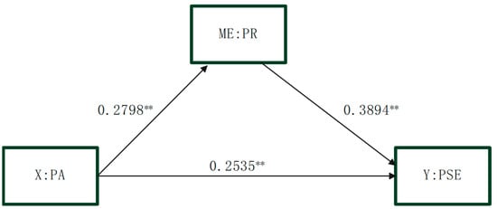 Mediating effect of psychological resilience between physical activity and physical self-efficacy. Note: The path coefficient is expressed as a standardized value (β); ** p < 0.01.