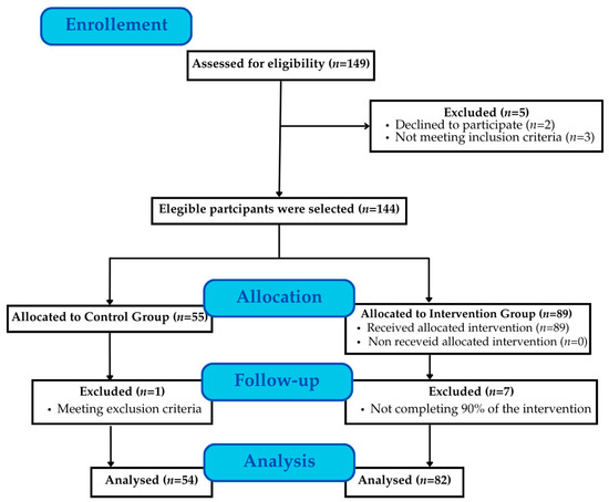 A total of 149 students from the Faculty of Education Sciences at the University of Granada (Andalusia, Spain) were assessed for eligibility and inclusion in the study (Figure 1). All participants were in their fourth year of the primary education degree, specializing in physical education, during the 2023/2024 academic year and followed a continuous assessment evaluation mode. Inclusion criteria were (1) being enrolled in the physical education specialization of the primary education degree program and (2) availability to attend at least 80% of the intervention sessions.