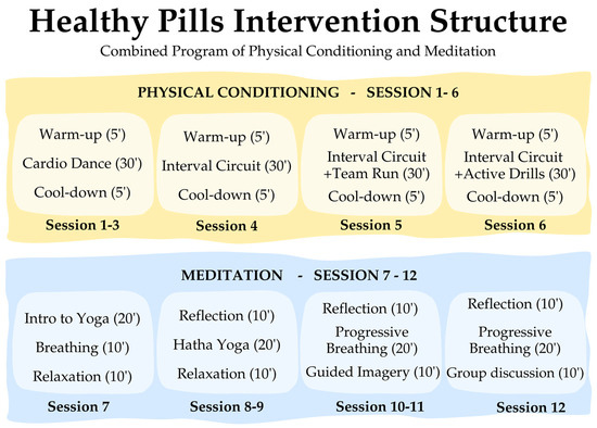 The “Healthy Pills” intervention was administered to the experimental group over 12 weeks, over three months, with weekly sessions lasting 40 min. The intervention was conducted from September to December 2023. Both the CG and IG completed the pretest one week before and the posttest one week after the intervention. The structure of the intervention is summarized in Figure 2 (while a more detailed version is available in Supplementary Materials, Figure S1).