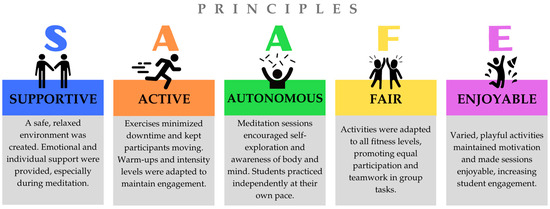 The intervention followed the SAAFE principles, as outlined by the Priority Research Centre for Physical Activity and Nutrition at the University of Newcastle (Figure 3). Additionally, the Transparent Reporting of Evaluations with Nonrandomized Designs (TREND) guidelines were followed to ensure transparency and quality (Des Jarlais et al., 2004) (Supplementary Materials, Table S1). A fidelity analysis was conducted to confirm that the observed outcomes were attributable to the program, following the steps outlined by Nelson et al. (2012), which include defining the intervention, developing a measurement system, monitoring implementation, evaluating fidelity, and providing feedback for adjustments. Standardization and protocolization ensured that all components were implemented consistently and systematically.