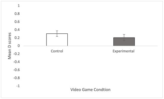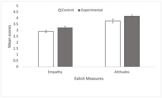 A t-test showed that the explicit attitude scores were significantly greater amongst those in the experimental condition (M = 4.169, SD = 0.671) than those in the control condition (M = 3.777, SD = 0.972), t(74) = 2.057, p = 0.022, d = 0.472, supporting H1. Similarly, the empathy scores were significantly greater amongst those in the experimental condition (M = 3.240, SD = 0.623) than those in the control condition (M = 2.911, SD = 0.592), t(74) = 2.358, p = 0.011, d = 0.541, supporting H2. In relation to RQ1, while the IAT scores were smaller on average amongst those in the experimental condition (M = 0.209, SD = 0.490) than those in the control condition (M = 0.308, SD = 0.429), this difference was not significant, t(70) = 0.912, p = 0.182, d = 0.215. Figure 1 and Figure 2 show the mean and standard errors for explicit (Figure 1) and implicit (Figure 2) measures.