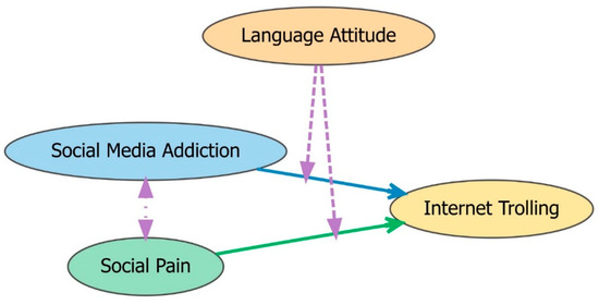 Chicago/Turabian StyleXu, Qingshu. 2025. "Investigating the Moderating Effect of Language Attitude in the Interplay Among Social Media Addiction, Social Pain and Internet Trolling in College Students" Behavioral Sciences 15, no. 5: 586. https://doi.org/10.3390/bs15050586