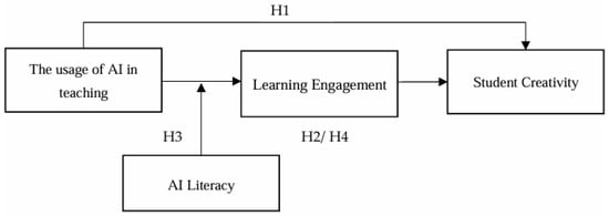 Based on the conservation of resources theory, the usage of AI in teaching, by increasing learning resources, improving learning support, and promoting interaction, can effectively improve students’ learning engagement (M. Wang & Kang, 2006). For example, AI technology can identify students’ weak learning areas through big data analysis and provide targeted supplementary resources; virtual reality (VR) technology can create an immersive learning environment, increasing the fun and interactivity of learning (Conrad & Openo, 2018). Meanwhile, the enhancement in learning engagement further stimulates students’ creativity. Therefore, learning engagement plays a key mediating role in the relationship between the usage of AI in teaching and students’ creativity (Mercer, 2019). Based on this, the study proposes the following hypothesis: