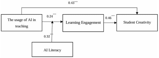 The means, standard deviations, and correlation coefficients of the variables involved in this study are shown in Table 1. From Table 1, we can observe the following significant correlations: the usage of AI in teaching is positively correlated with AI literacy (r = 0.17, p < 0.001), learning engagement (r = 0.28, p < 0.001), and student creativity (r = 0.23, p < 0.01). Learning engagement is positively correlated with student creativity (r = 0.28, p < 0.001). These correlations provide preliminary support for the hypotheses presented in this study.