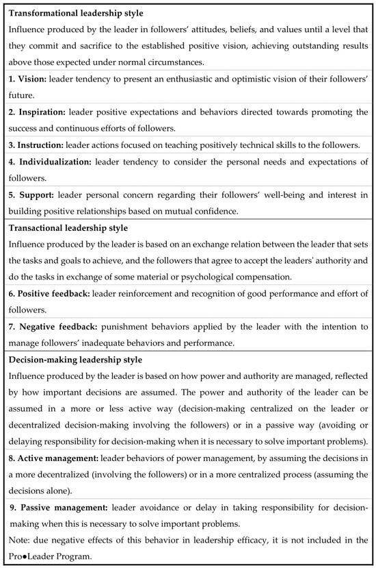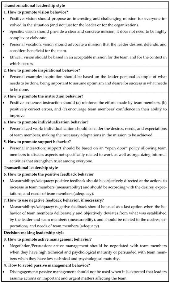 The second factor refers to the specific behaviors that leaders adopt when exerting their leadership. Based on previous literature that has tested psychological measures of leadership behaviors (; ), the LEM highlights three different styles of leadership (transformational leadership, transactional leadership, and decision-making leadership) and nine leadership behaviors divided into transformational leadership (vision, inspiration, instruction, individualization, and support), transactional leadership (positive and negative feedback), and decision-making leadership (active management and passive management). Transformational leadership relates to the leaders’ ability to promote change in their followers’ attitudes, beliefs, and values towards the goals of the group/organization, so that leaders’ vision becomes internalized (cf. ; ). In order to do so, leaders display a positive and enthusiastic vision, inspire followers to make continuous efforts to achieve success, provide instructions to help them develop skills, and attend to the individual needs of each follower by supporting their interests and wellbeing (). Transformational leadership has been widely researched (; ; ; ), representing a major topic of analysis when it comes to studying the effects produced by leadership (; ). The popularity of this form of leadership remains intact even though new forms of leadership have been developed. However, these new proposals, such as moral and ethical leadership, authentic leadership, and servant leadership, appear to overlap significantly with transformational leadership (; ; ). On the other hand, the transactional style of leadership is based on exchange systems, in a “negotiation” between what leaders want and what team members provide (cf. ). More specifically, when using this approach, leaders tend to respond to their followers’ actions and performance, managing them using positive and negative feedback () to establish and promote the desired behaviors. The third and final style is related to how leaders make decisions or, more specifically, how they manage their power (). Decision-making leadership behaviors differentiate between active and passive management, referring, respectively, to whether leaders tend to share or not share leadership power and whether they involve followers in decision-making related to the teams’ functioning ().